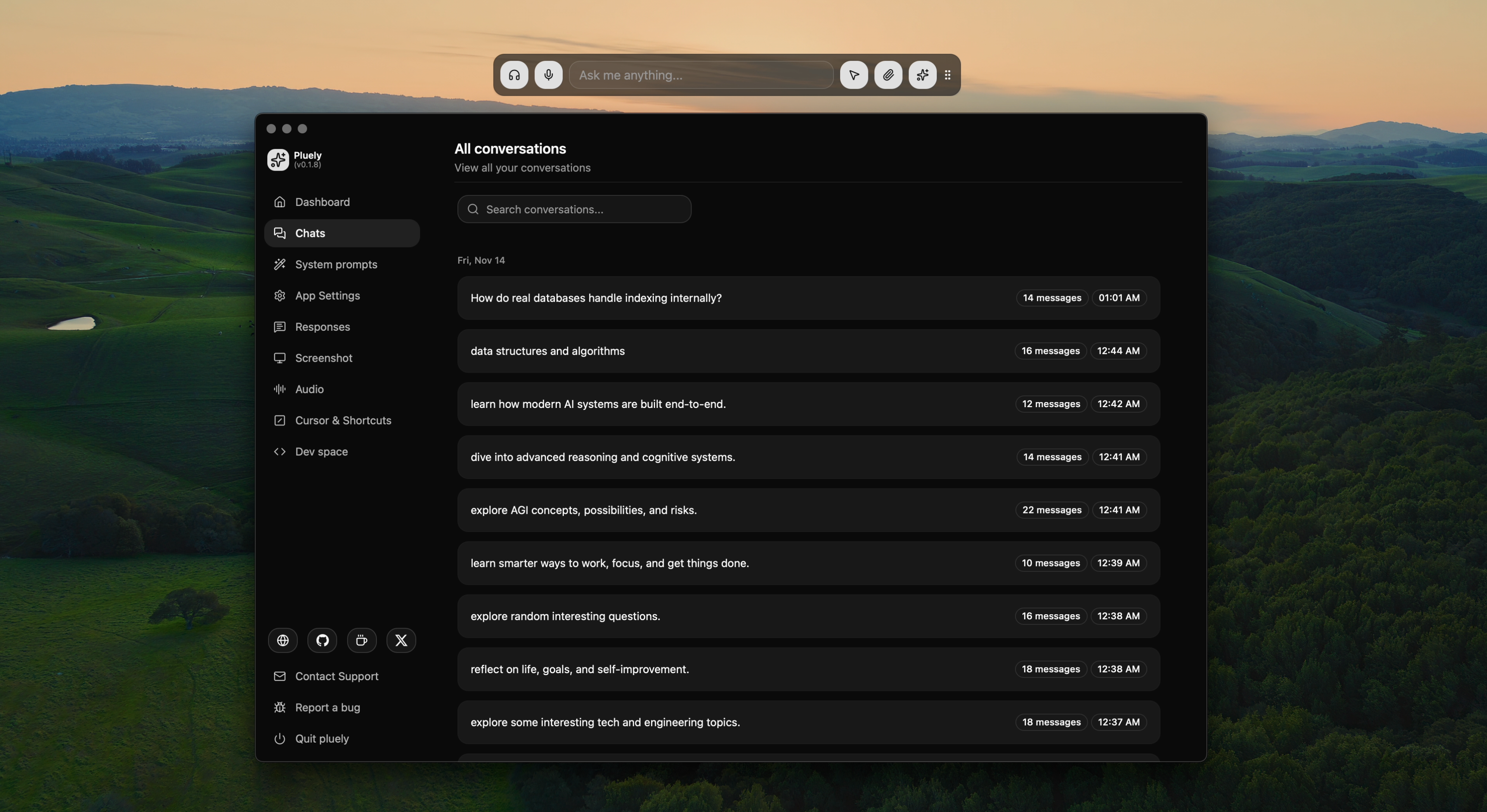 Fully customizable global shortcuts for instant access. Toggle window, Dashboard, System Audio, Voice Input, Screenshot, and more with custom keybindings.
